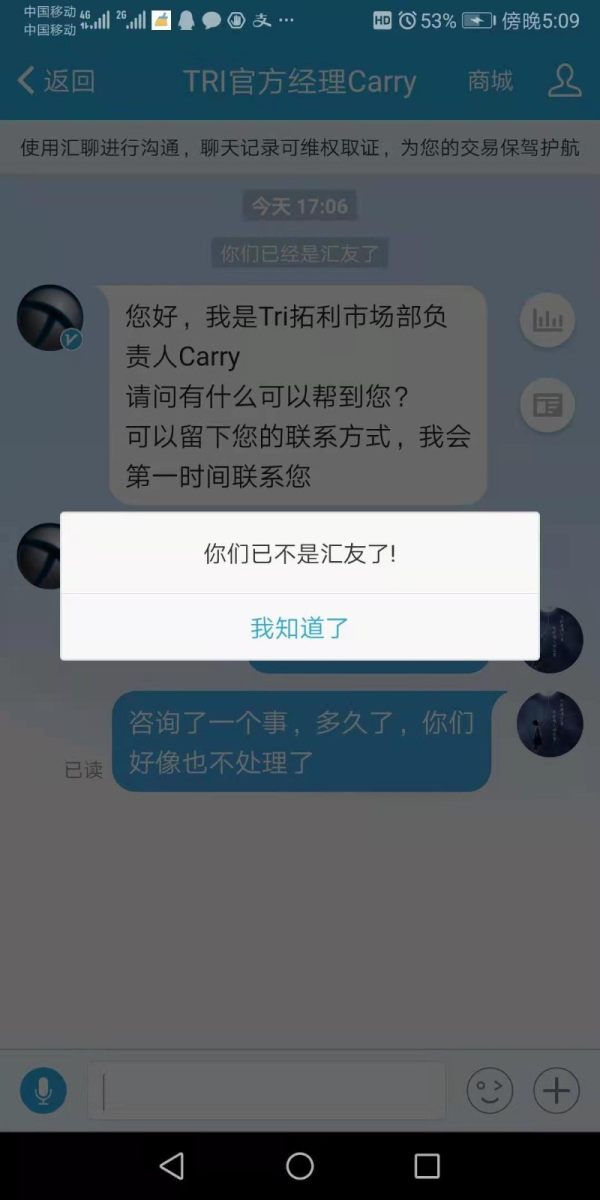 我在拓利平台交易不到两个星期 账户被禁用 后台也登不上 咨询情况话还没说完直接把我删了 官网客服联系也不理人 我的钱全被平台吞走啦