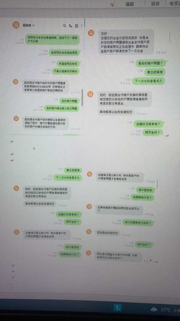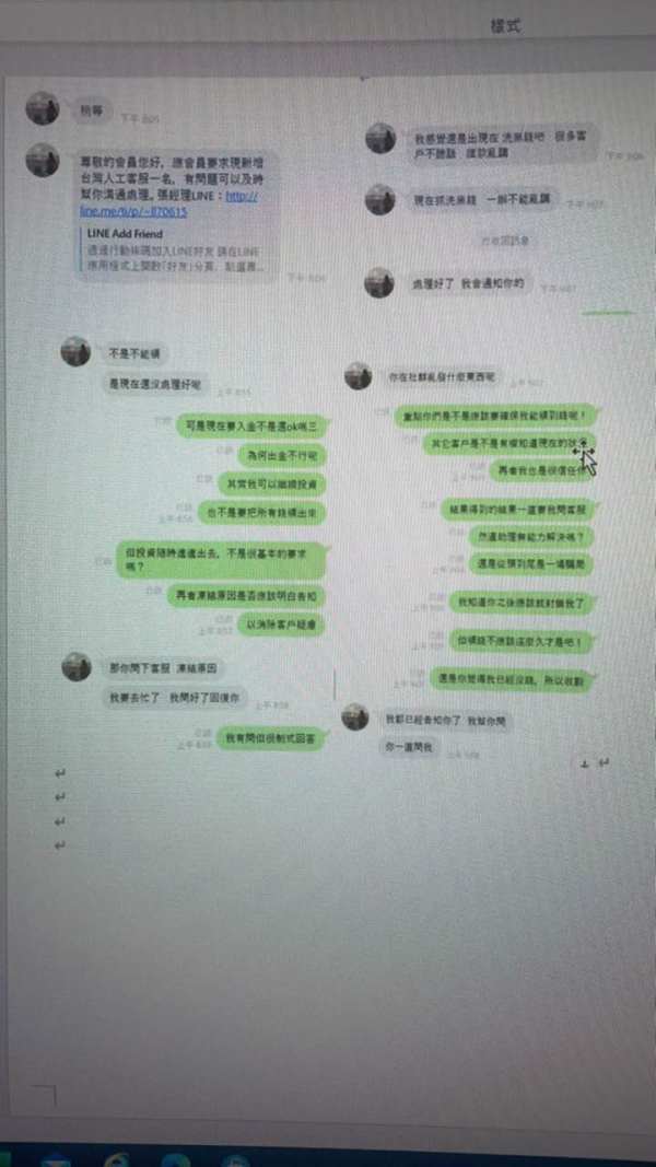 一、PO此文希望能減少受害者(第二封補圖) 二、該群組打著一致性交易兼演算性交易法則,採用精英會員(1萬美元,月獲利20%),中級會員(5萬美元,月獲利25%)、高級會員(15萬美元,月獲利35%)、皇家會員(30萬美元,月獲利50%),並聲稱百分之百獲利,一開始出金成功來讓會員信任,並多方寒噓問暖來加深信任關係,中間會不定期誘使會員升級更高級會員並提供其它會員匯款之資料,一旦確認你沒有資金可以再投入,後續出金就會有問題,詢問客服助理會推拖會員個人帳戶涉級洗黑錢,導經紀商合作商戶匯款以後他的戶頭被凍結,但個人帳戶轉帳沒什麼問題,也沒警方來詢問,不懂他們回覆是我帳戶問題之合理性。但其它新加入會員也許能出金, 三、採用MT4確實能看到獲利,只是獲利看得到吃不到。 四、提供助理line圖片(我有加入4個群組,因無法取得她的ID),但另有客戶助理LINE:http://line.me/ti/p/~ll70615(可能之後會換帳號)。