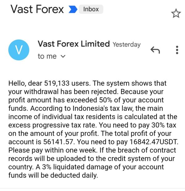 Hi, I have a problem. I was able to withdraw once previously. But then, when I got profit over 50% from my account, I need to pay the income taxes. Apparently I need to pay income taxes by topping up again USDT to different account, but all my funds is in there already. I thought I am going to be the one paying the tax office here. But it's not. So I was proposing to auto-deduct the fund directly if they are the one who is going to pay them to the relevant tax department. I will just take remaining. But they said that they don't have the right to deduct from the funds.