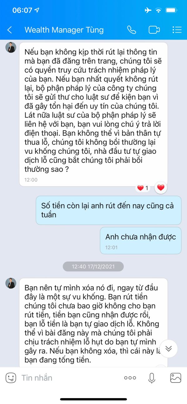 Sàn lừa đảo tự giao dịch thua lỗ và không cho rút số tiền còn lại. Nhân viên tự giao dịch thua lỗ dẫn đến cháy tài khoản của tôi gần 76.618 đô la và bây giờ tôi cũng không thể rút được số tiền còn lại hơn 3.109 đô la. Tôi làm lệnh rút tiền từ ngày 12/12/2021 đến nay vẫn chưa nhận được tiền. Tôi liên hệ bạn chăm sóc khách hàng tự giới thiệu là chuyên viên quản lý của sàn nhưng rất nhiều lần vẫn không trả lời. Yêu cầu sàn trả lại tiền cho tôi. Tôi sẽ đăng đến khi nào nhận lại được tiền của tôi.