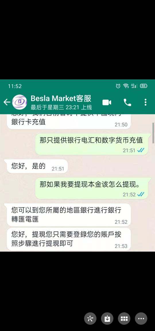 Besla Market ltd这是个黑平台,诱导充值后本金都无法体现。按照客服说的步骤进行体现,直接账号冻结。要求缴纳税金才可以体现。后面询问客服一个回应都没有。