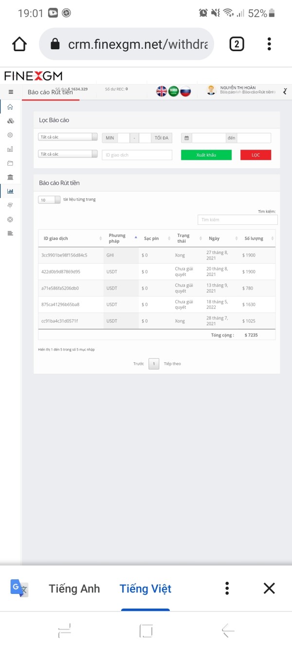 tôi giao dịch có lãi. tôi rút tiền lãi từ ngày 18/05/2022 vẫn chưa giải quyết.