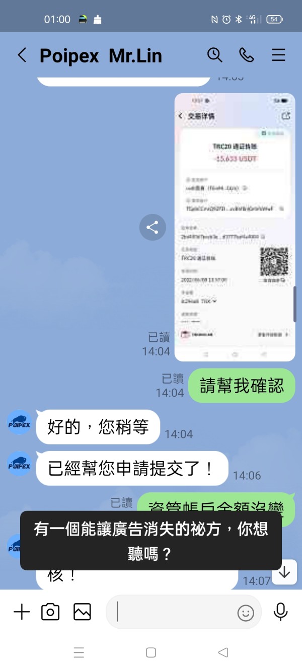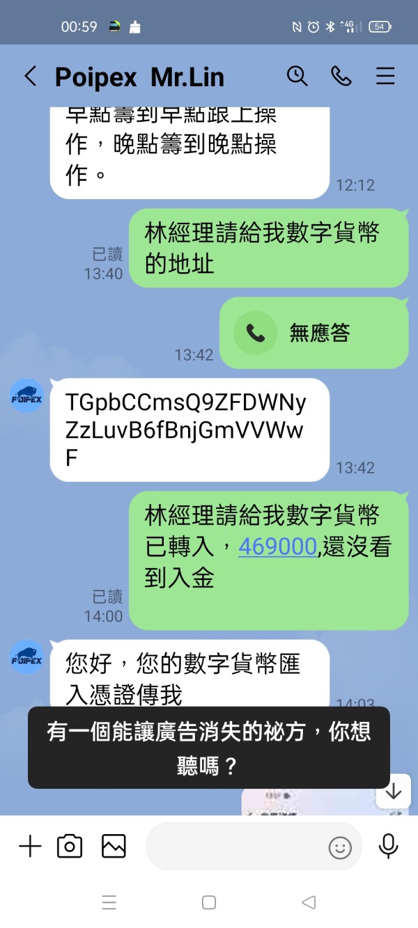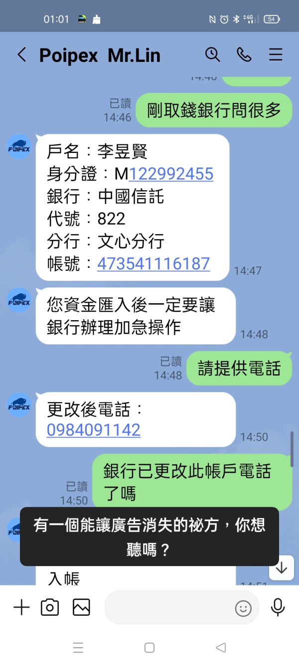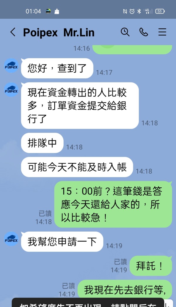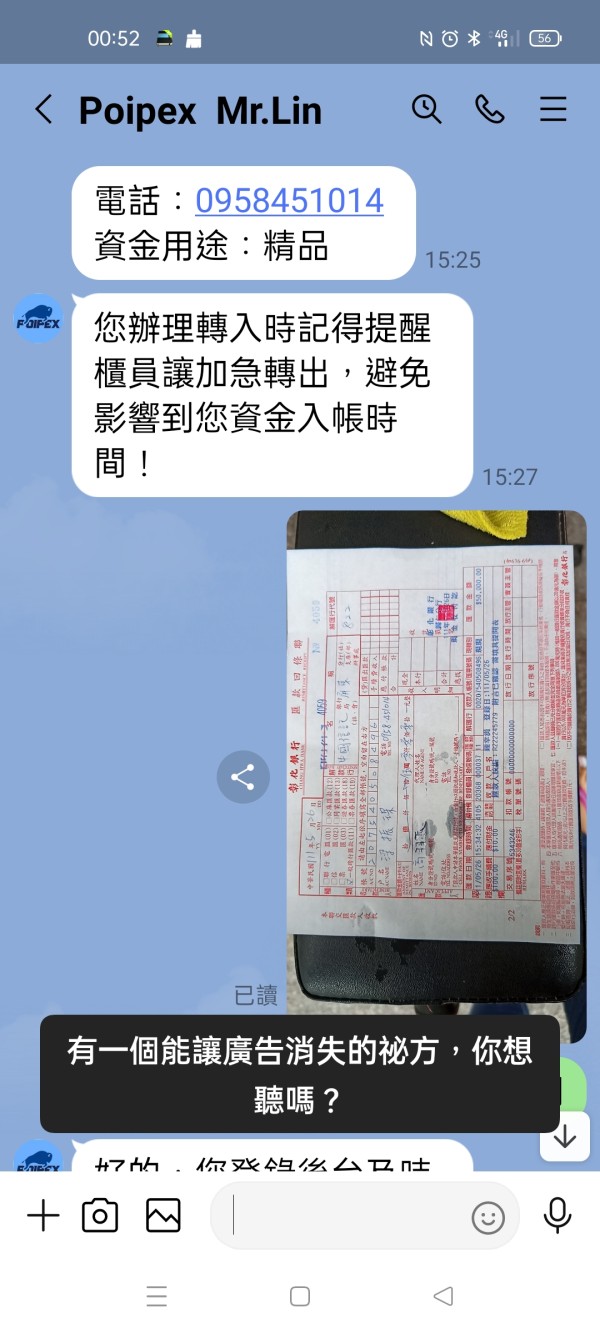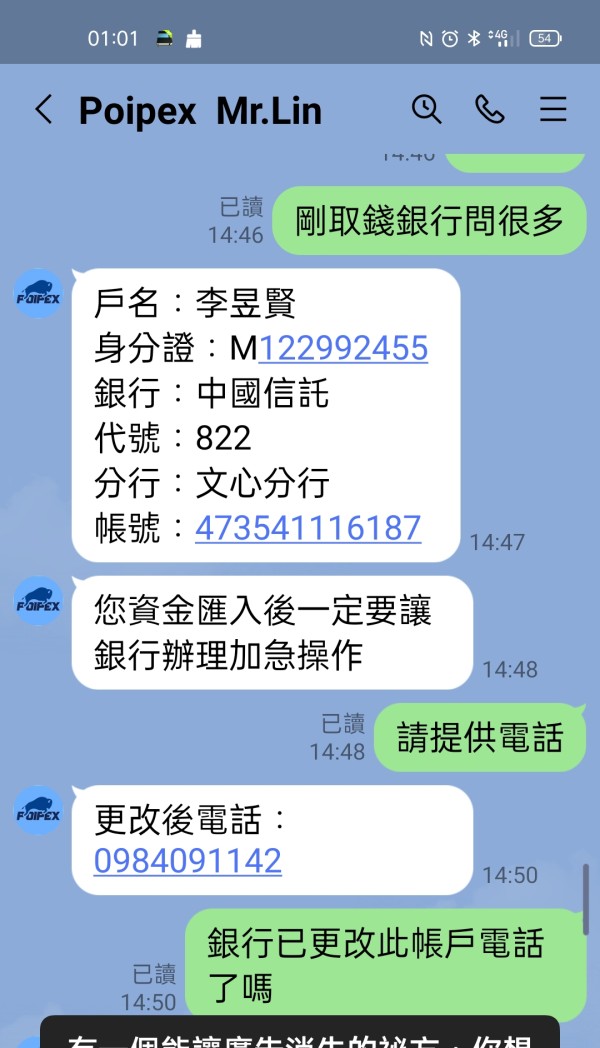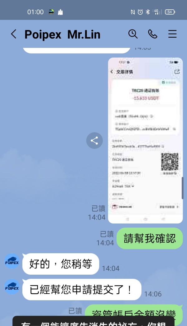 下方照片是我存入Poipex資管帳戶的資金,還有存入時和平台林經理的對話,還有出金隔天說已在銀行系統中,最後又說太多人出金,還在系統排隊中,到現在已經10幾天了,出了好幾筆,加總380萬,全部未到帳,一直要我再繳50萬台幣辦理快速通道,說兩小時可到帳,他說他公司在香港九龍,我也願意辦理但我要求由香港朋友拿錢當場辦理,請他給聯絡電話,地址,說好的,最後沒給,也不接LINE電話了,