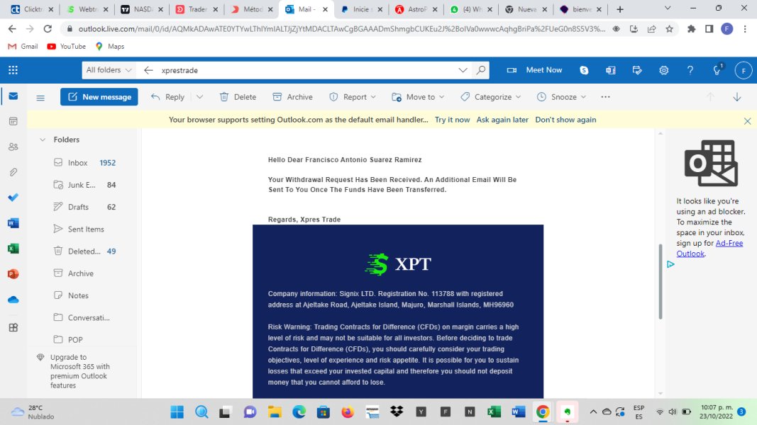 Expongo esta denuncia publica para prevenir a otros que les pueda pasar lo mismo, este supuesto broker cuenta con todo el montaje de un broker normal, llamadas asesoria, todo lo normal. En ese momento no sabia muy bien del tema y cometi el error de no investigarlo bien, fui asesorado al comienzo un par de meses por la señora maria martinez dejo las pruebas de conversaciones via wassap, cuando ya tenia algo de idea me asignaron otro gestor llamado esteban cardona el cual me enseño un poco mas y me configuro un boots interno muy eficiente que yo supervisaba aparte de las ordenes que yo ingresaba, poco a poco en cuestion de 4 meses fui subiendo mi cuenta comence con 250 usd de deposito despues ingrese 500 usd asesorado por maria para poder arriesgar un poc mas en mis ordenes de entrada, conclusion con ayuda del boots que reliazo unas ordenes muy buenas de 7400 con el oro, de 3000 y 4000 en petroleo se logro subir la cuenta en el ultimo mes a 19.000 usd, ahi ya solicite retiro porque me mantenian que esperar mas para gestionar un retiro cuando les planteaba el tema al comienzo por falta de experiencia no lo venia anormal, nunca pude reealizar retiro siempre me decian una cosa o otra que debia de pagar unas comisiones para descargar pagos parciales, me asignaron un ultimo gestor llamado ricardo, con muchas llamadas y explicaciones para realizar un deposito minimo de 250 usd para retirar 5000 usd el cual nunca sucedio, tener cuidado con este broker estafa, no sigan engañando.
