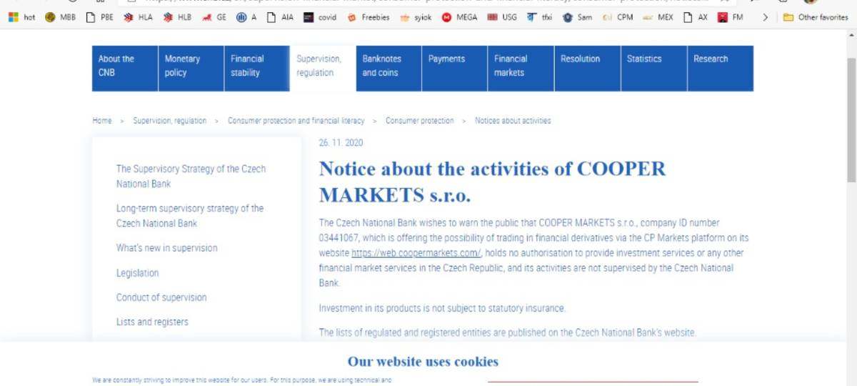 BINGO, CPM has no regulation in CNB https://www.cnb.cz/en/supervision-financial-market/consumer-protection-and-financial-literacy/consumer-protection/notices-about-activities/Notice-about-the-activities-of-COOPER-MARKETS-s.r.o./ The Czech National Bank wishes to warn the public that COOPER MARKETS s.r.o., company ID number 03441067, which is offering the possibility of trading in financial derivatives via the CP Markets platform on its website https://web.coopermarkets.com/, holds no author