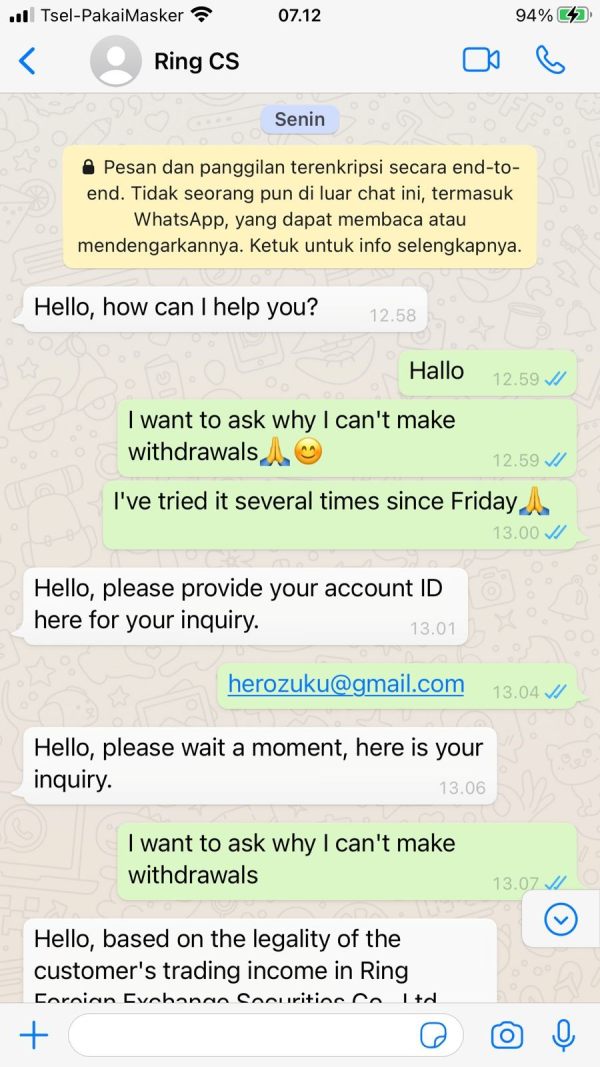 tidak ada respon dari broker setelah saya menggunggah hasil percakapan bahwa tidak ada pajak untuk setiap penarikan saldo dari costumer service mereka, pihak broker dari RING LIMITED FINANCIAL tidak ada niatan yang baik untuk mengembalikan semua saldo saya, jangan pernah memakai broker ini, ini PENIPUAN