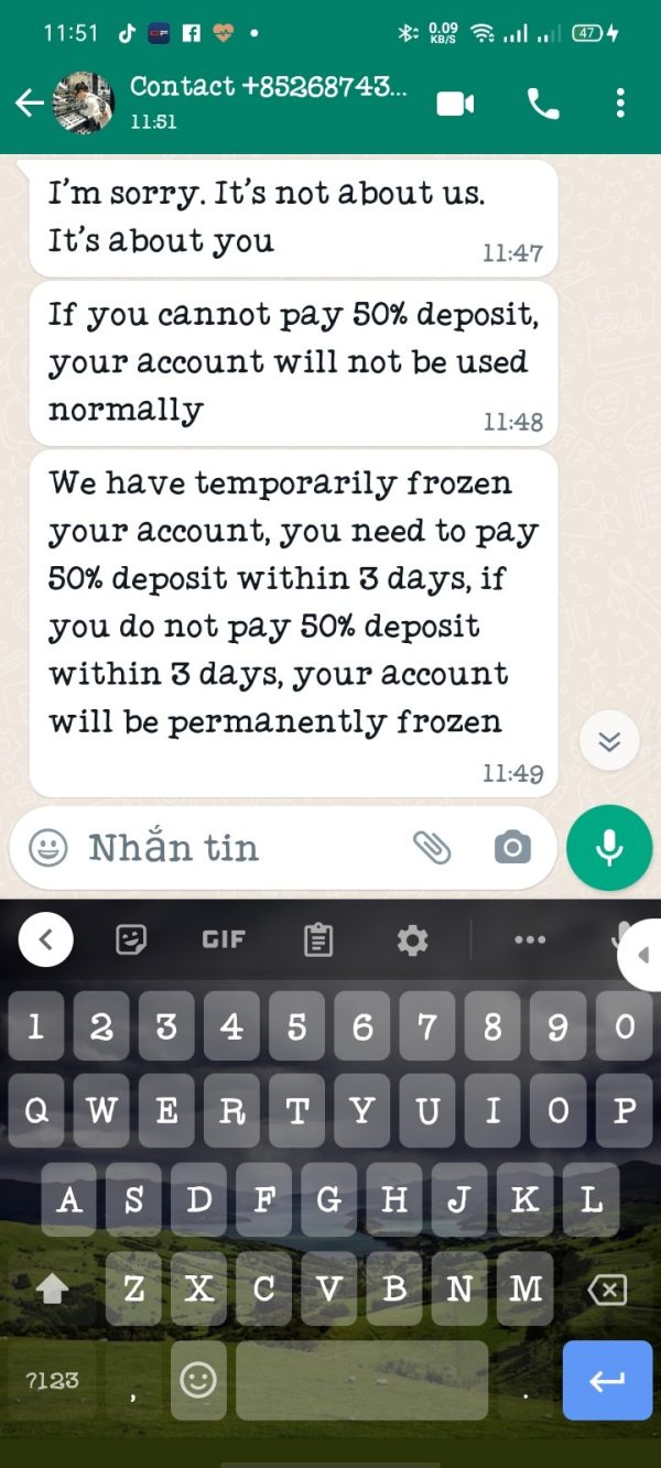 Tôi quen một người và họ giới thiệu cho tôi sàn INPC Market để giao dịch. khi tôi giao dịch có lãi thì tôi muốn rút gốc về và 2 lệnh rút đầu mỗi lệnh rút 100$ thì được khi tôi rút 500$ không được chấp nhận. Nhận được thông báo là tài khoản có nguy cơ bị đánh cắp yêu cầu ký quỹ 50% tài khoản lúc đó tài khoản của tôi là 1414$ phải nạp thêm 707$ nữa thì mới được mở khóa tài khoản và rút tiền. Mọi người nên cân nhắc khi đăng ký INPC. Tôi đã mất tiền ngu.