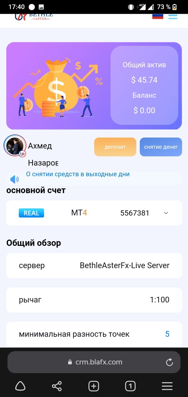 хочу вывести свои средства с биржи BlaFX в размере $45,74 . Но не могу этого сделать, пожалуйста помоги в решении данной проблемы.