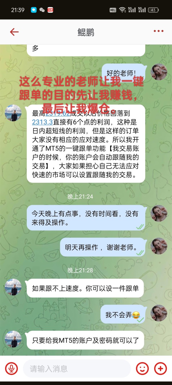 你说这么赚钱的平台,怎么把我们的钱给吃了?群里有两个老师。一个是老莫扮演好人,一个是鲲鹏扮演坏人。张亮扮演的是我们的好朋友。张亮跟我说,鲲鹏老师说Mt5有一键跟单的功能。只要我们把账号和密码告诉他。他那边下单我们也跟着挣钱。张亮先发截图给我看,他说今天老师帮他赚了多少钱。我就有点心动了。就把账号和密码跟老师说了。我朋友也跟我一起跟老师操作了,我和我朋友前后各充了6万多美金,五天交易就翻倍变成20多万美金。张亮充了一百多万美金变到350万美金。正当我们说第二天要提现的时候, 早上起来一看账户冻结了,什么原因导致的呢?鲲鹏老师的解释是系统触发了保护机制?我们不是傻子,都能看出来就是故意陷害,让我们找刘经理。刘经理说让我充2.2万美金才可以解封,解封了那个钱才能提现出来,我又到处借钱凑了22000。充进去还是不能解封。刘经理又说还不够。还要充6万。这个时候派出所给我打电话了。说我账户异常。问我最近为什么那么多频繁转账?让我马上去说清楚。我当时都还没有清醒。还在想怎么筹钱解封,警察说不要再上当了。查了我手机上所有的聊天记录。说我被骗杀猪盘了。说这个平台就是骗人的黑平台。你再继续充钱也拿不出来的。我才人间清醒,赶紧跟另外两个朋友说,不要充钱了。我不知道群里其他人是不是跟我们一样? 还是只有我们几个是猪?我去求两个老师帮我们解封。提现了就还老师。他们不答应,明明可以办到的事,就是不帮。很明显他们就是想要吃我们的钱。让我们继续充钱,最后也不会让我们提现。我找张亮他也亏钱了。这不是你舅舅的朋友吗?可以让你舅舅出面帮我们。他说他舅舅不帮。让我们不要为难他。这下我才明白了。他们就是一伙的。一键跟单就是局,张亮那个账户也可能是模拟账户。两三天时间老师看我们没有在充钱,就找理由把我们踢出群了。现在连那个波克密聊软件账号都登不上了,MT5外汇平台账户也登不上了。目的达到了,张亮也消失了。就在一夜之间让我和我朋友变得一无所有。为了解封账户,还欠了一屁股债。