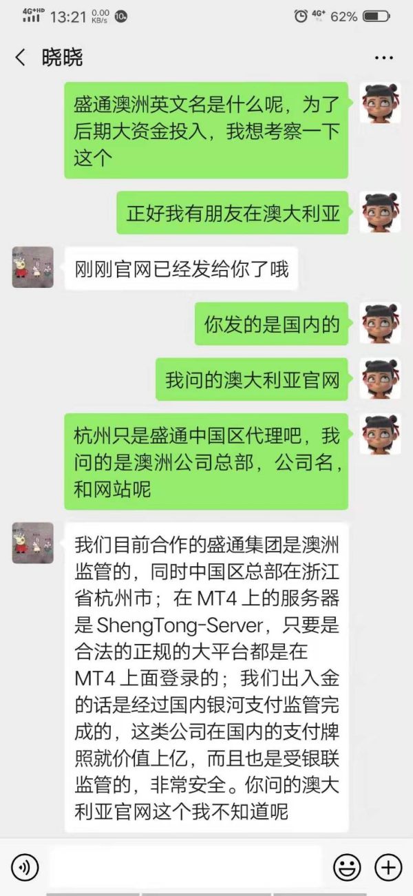 根据客服介绍,他们是盛通集团中国区代理,公司地址杭州市滨江区。9月10日投资1万美金,双方合资2万搞资管,10月18日账户亏损到4110美金,本人提出结算提款,客服晓晓(实名可能为张晓)拒绝提款,说要等到12月10日。12月16日本人提款,至今未到,联系客服晓晓将我拉黑,所谓的“汤老师实盘5群”里面也没人答复,无可奈何选择报警。