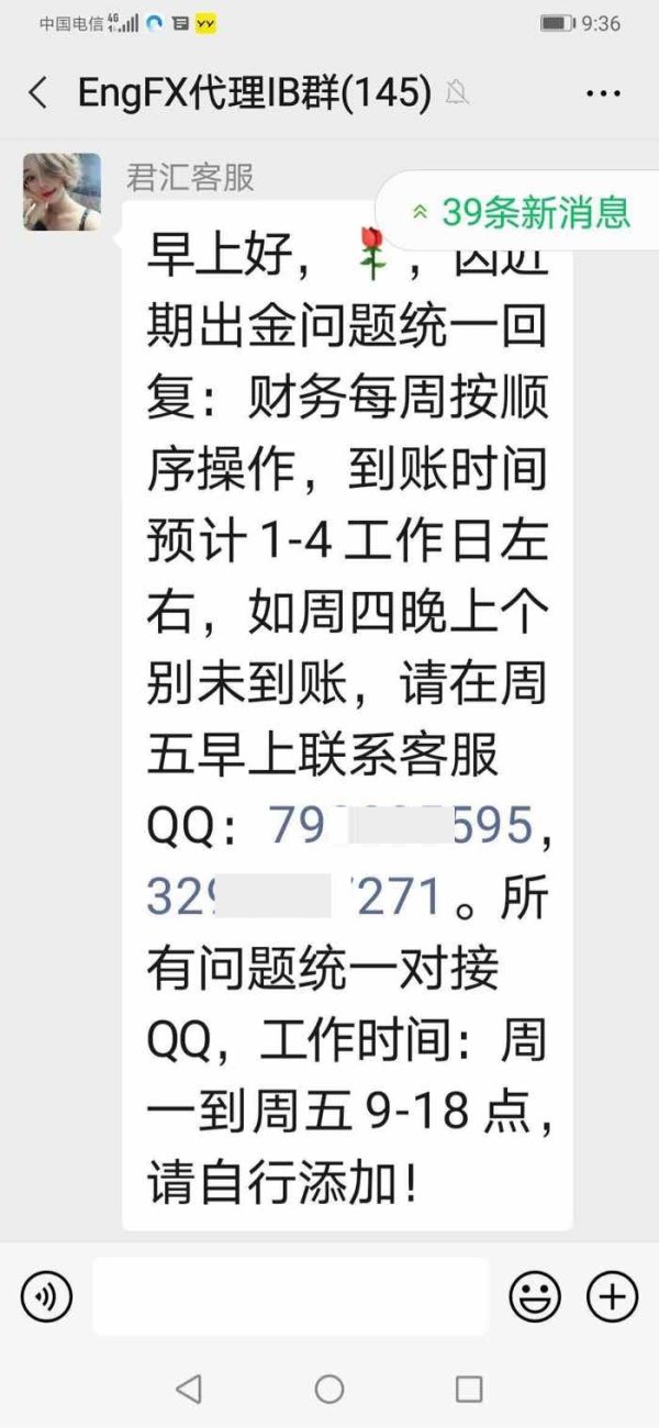 Eng君汇外汇,2020年8月3日公布的群消息,不能正常出金了,理由是第三方支付被冻结了。