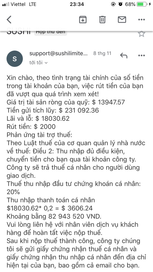 tôi rút tiền nhưng không về liên hệ chăm sóc khách hàng sushi yêu cầu nộp 20.% thuế trên tổng số tiền trong tài khoản. hãy giúp tôi lấy lại tiền
