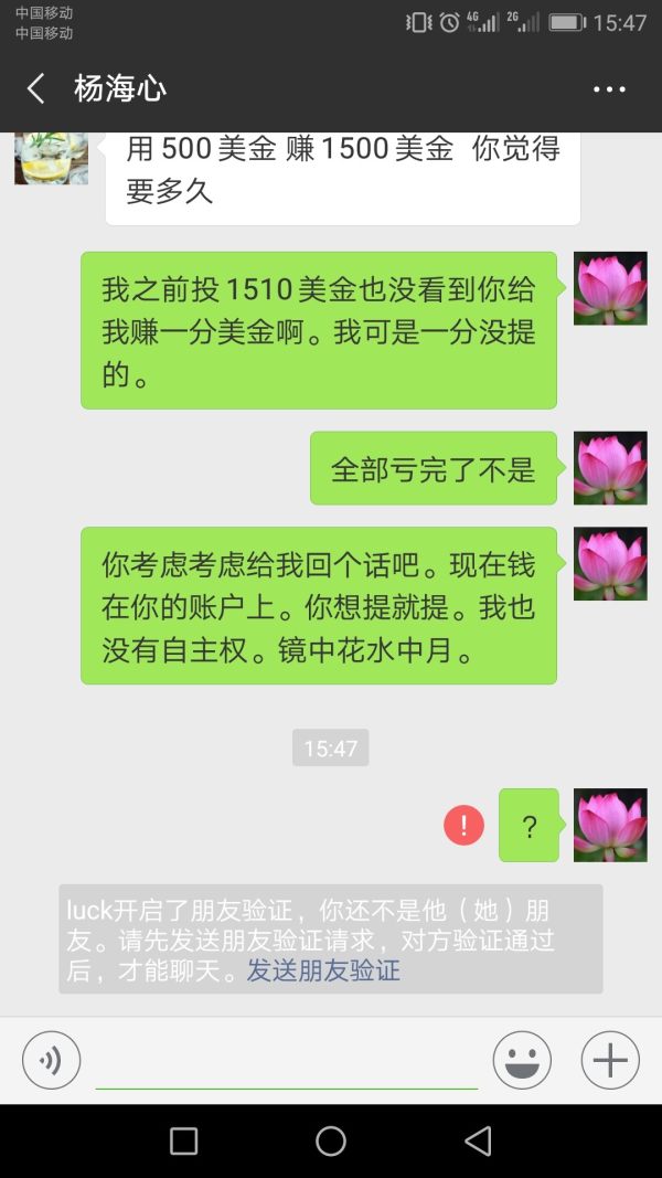 我与6月21号。该平台代理商找到我说可以稳定盈利给我。最低盈利每个月百分之十。随后我入金1000美金。不到半月。亏光了我的账户。然后又花言巧语的说一定帮我赚回来。让我重新入金500美金。操作。结果一样分分钟爆仓。结果我找他要说法。不但不理我。反而把我拉黑。这样的骗子希望平台处理好。尽快联系我协商处理。如果不协商处理。我会到处曝光。连带平台一块告。
