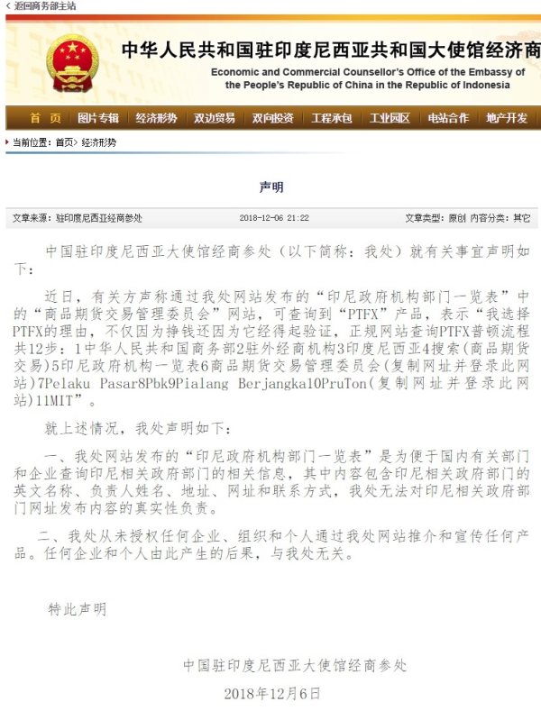 印尼大使馆经商参处宣布PTFX为虚假诈骗。
