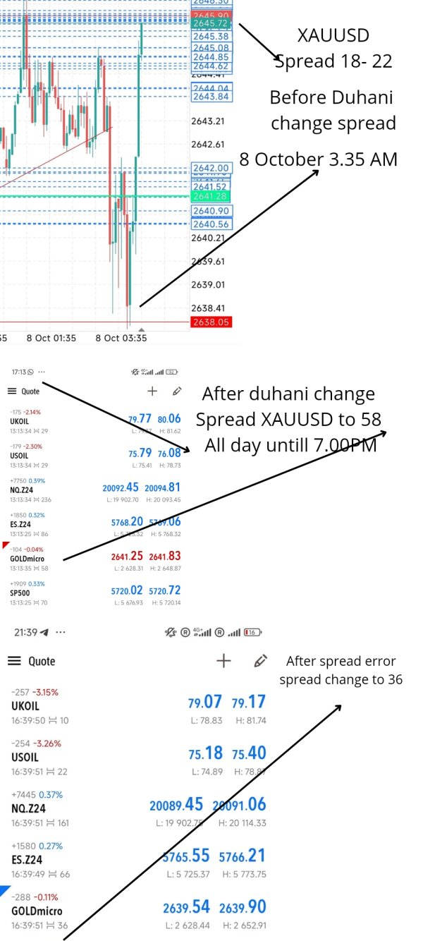 saya trading di Pair Gold dengan Spread 21 karena itu spread Standar duhani. pada tanggal 8 Oktober tiba-tiba spread 58 pukul 04.00AM - 7.30PM setelah lewat dari jam itu sampai sekarang adalah 35. yang artinya mereka merubah spread / maintenance tanpa memberikan pengumuman terhadap client. sehingga menyebabkan kerugian kepada saya. 1. Saya tidak bisa menarik keuntungan saya $1000-$1200 karena alasan lot saya kurang 2. saya terkena slippage ketika membuka posisi baru, yang terlempar jauh 3. Posisi SL yang dipasang jauh, tapi terkena SL baik di Pair Gold dan OIL 4. Saya melakukan take profit posisi, equity bukannya bertambah malah minus saya melakukan komplain karena memang jelas mereka melakukan kesalahan dan tidak hanya saua saja yang mengalami ini tetapi ada trader lain juga, tapi mereka mengabaikan karena kerugian hanya sedikit. bukti foto dan video bermasalah cukup lengkap tapi mereka tetap tidak bertanggung jawab dan tidak Fair seperti perusahaan lainnya. detail on my Commun