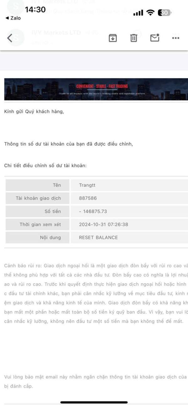 ID MT5: 887586 Tên : Trần Thị Trang SĐT : 0947681758 - Tôi có tham gia đầu tư tại sàn IVY MARKETS nhưng sau gì đầu tư vốn 70.000 USD và đầu tư lời nhuận 146.000.000 USD thì rút không được và sàn đã tiến hành thu hồi hết tiền của tối với lý do gian lận , trong khi đó tôi giao dịch mọi thứ đều theo giá cả thị trường , tôi thấy đây là dấu hiệu của việc lừa đảo , rồi viên lên đây cho mọi người cảnh giác , và tôi sẻ đâm đơn kiện lên cơ quan công an , ngoài ra phốt ở tất cả các trang mang để mọi người né tránh .