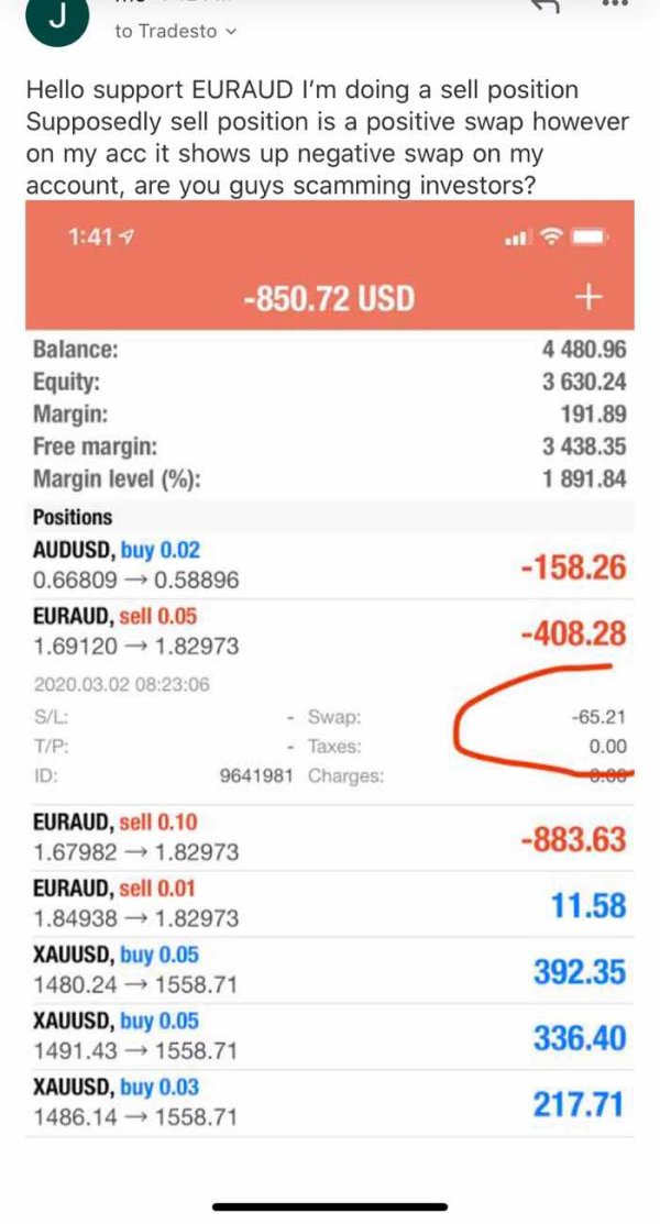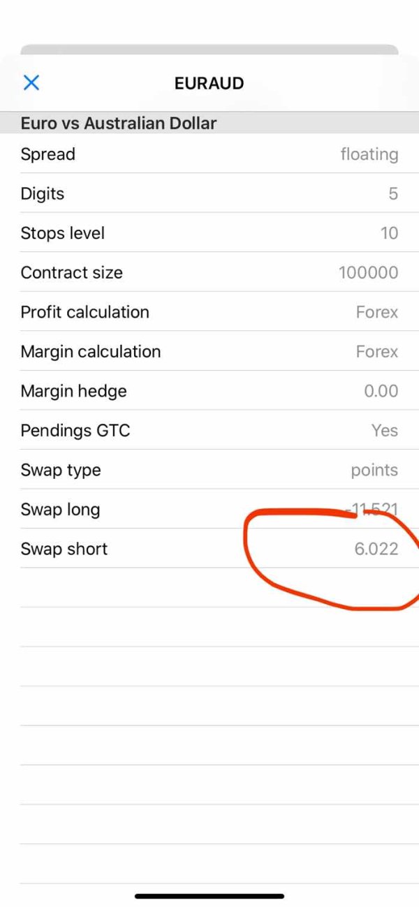 EURAUD sell position supposedly is giving us a positive swap however it charge us with negative swap