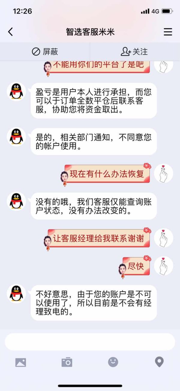 黑平台,客户存进去多少钱取出来多少钱,盈利亏损都查不出来,就是垃圾平台,而且点差高的要死,最高14美金🉐点差我们能赚钱吗请问,没有人通知直接号被封掉,只能平仓,这么霸王条款吗