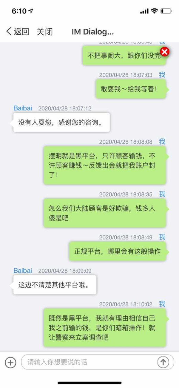 黑平台,客户存进去多少钱取出来多少钱,盈利亏损都查不出来,就是垃圾平台,而且点差高的要死,最高14美金🉐点差我们能赚钱吗请问,没有人通知直接号被封掉,只能平仓,这么霸王条款吗