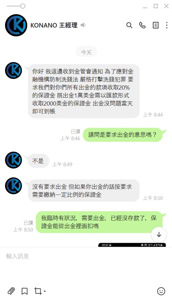 Konano:收到金管會通知 為了應對金融機構防制洗錢法 嚴格打擊洗錢犯罪 要求我們對你們所有出金的款項收取20%的保證金我打電話到金管會問,他們說他們沒有在管網路平台金管會:0289680899 打網站上交易商的電話:語音是NSFX company