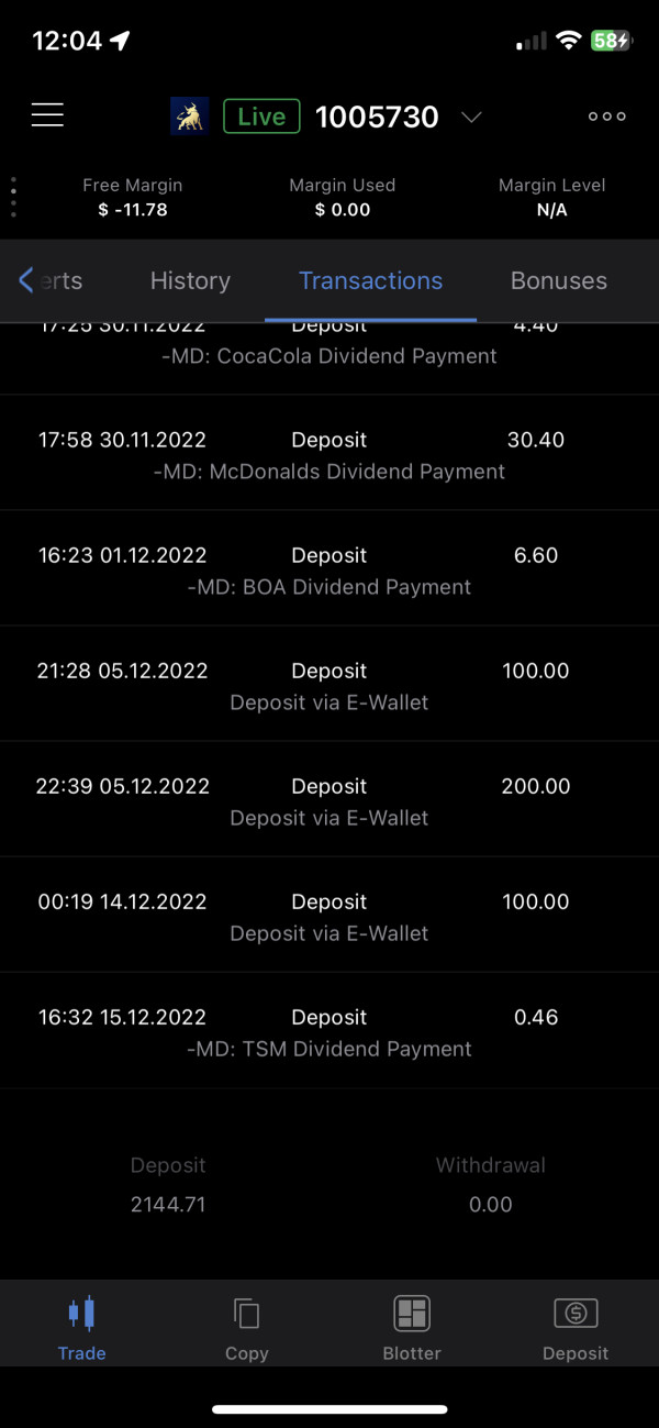 这个平台的中介人不靠谱,如果要投资千万不要 投太多钱,一开始我投了100usd,然后爆仓了,过后他叫我加1000usd保证盈利,可是我告诉他我没有这样多,他叫我进500usd(用 bonus来诱导),过后快爆仓了他叫我再入金100,结果没有用、又爆仓了,过后他叫我入 1000usd (用bonus诱导我入金),100%可以 赚回700usd,结果撑了1-2个月,爆仓了,过后他叫我加钱来保住(也是用bonus来诱导),我相信不是我的问题,我自己投资没有亏损,后两张图是我自己投资