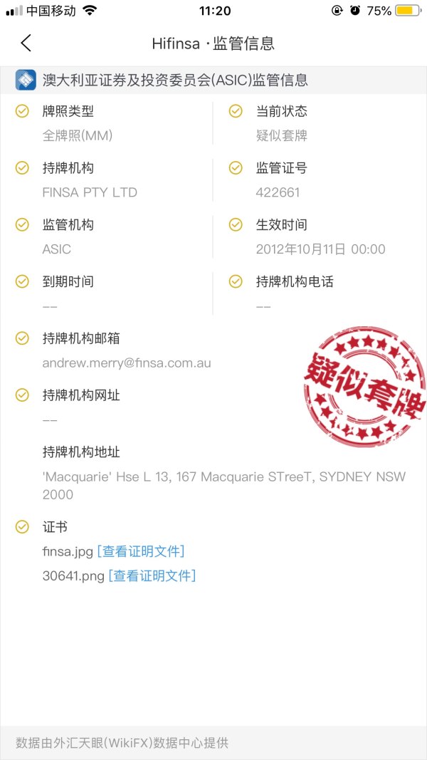 自己搭建小平台,对接国际数据,号称澳大利亚监管422661,实际查不到,资金进入公司账户!大家不要相信!天眼能查到的套牌黑平台和这个FINSA用的同样的监管号!黑平台网址:www.finsaptyltd.com这个黑平台和之前的LNF,欧亚都是一个人!