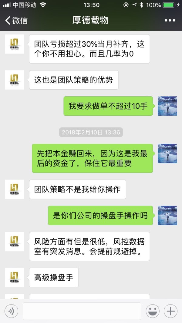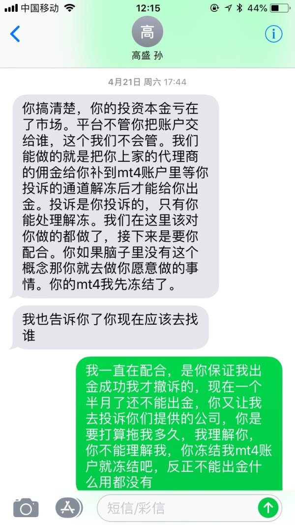 2018年1月,一个微信名叫厚德载物(hdzw139,自称叫徐震鹏)的人加了我的微信,说他是回金团队的(后来知道这个团队就是给高盛国际平台拉客户的),能通过合作帮助炒黄金外汇亏损的人挽回损失,如果合作的话就要到他的平台高盛国际开户,他声称高盛国际这个平台没有手续费、点差低、可以返佣金。在他的诱骗下,我在高盛国际前后开了3个账号,其中两个标准账户入金3千美金,另外一个vip账户入金2万美金,共入金2万6千美金。跟他合作有两种方式,一种是他喊单带我操作,一种是将我的账户和密码提供给回金团队托管操作,据厚德载物称团队托管是由高级操盘手代为操作。我一开始跟他合作的方式是听他喊单带我操作,结果一个3千美金的账户很快就亏没了,然后他说为了挽回损失,你可以选择让团队托管操作,并向我保证团托管操作保证不亏,就算亏损也会在下个月补给你。在他的诱骗下,我将我的有2万美金的vip账户和密码交给了他们,结果2万美金他们重仓给我操作了70手货币兑,2天时间账户就穿仓了,账户净值居然变成了负值。厚德载物翻脸不认账,不承认是他们的操作导致的穿仓,我这才意识到被骗了。 被骗后,我在网上找到了一个法律咨询公司,这个法律公司通过投诉高盛国际的第三方支付通道国付宝帮我维权。一周后,一个自称高盛国际中国区总经理的孙姓男子电话联系了我,经过与他的多次协商,他同意将资金补回到我的高盛国际账户,并保证能出金成功,要求我按他们的要求在国付宝撤诉。等他将资金补回到我的账户,我也录下了他保证出金成功后的录音后,法律公司让我撤诉了。我一步一步按照孙某的要求撤诉后,孙某以老总出差不在、第三方支付没收到撤诉邮件等各种理由拖延不给出金,刚开始保证一周就能出金,后来2个月了也没给出金,又反而让我去投诉北京的一家公司,我找他理论他反而责怪我是我自己在国际外汇市场亏了钱,现在找他做什么,我看清了他的嘴脸跟他理论闹翻后,他将我的平台账户停用,平台网络后台也无法登陆。后来我跟法律咨询公司二次投诉他们的第三方支付通道,结果不予受理了,原来孙某当初保证我出金就是为了让我尽快在他们的第三方支付通道撤诉,真是个满嘴谎言的奸诈小人。 目前来看,高盛国际这个平台网站还能登陆,还时不时发布赠金公告,可以说这个平台还没有跑路,但是这个平台就是个黑平台,很多炒外汇黄金的朋友都被骗了,希望大家尽快远离,珍惜自己的血汗钱 。 附:跟厚德载物的微信聊天截图 跟孙某的手机短信聊天截图