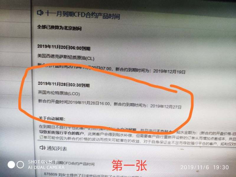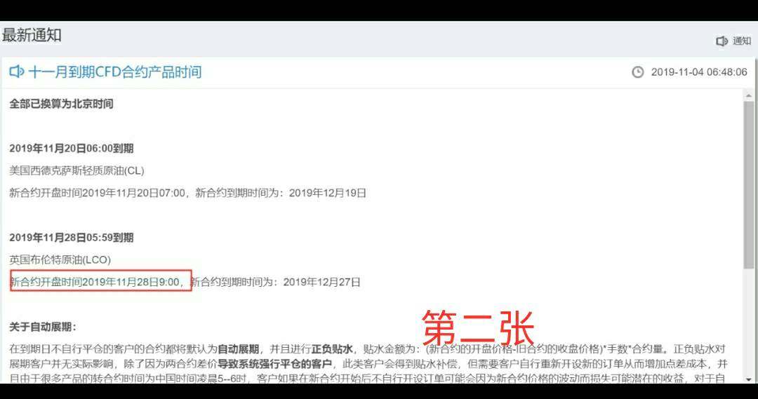 第一张图是拓利平台11月初公告换合约时间为11月28日16点,第二张图是我在11月28日那天晚上看到平台没有更换合约向客服反应,拓利平台立刻修改公告更换合约为11月28日9点,第三张图是拓利平台11月27日21点旧合约最后收盘价64.14,第四张图是对应布伦特01合约(旧合约)28日凌晨5点收盘价64.08,第五张图是拓利平台修改更换合约为11月28日1点,所谓新合约11月28日1点开盘价63.87,拓利平台时间与北京时间相差8小时,其实它只是第六张图布伦特01合约(也就是旧合约)11月28日9点开盘价63.85,而真正新合约却是第七张图布伦特02合约(这才是要更换新合约),新合约11月28日9点开盘价是62.84,这也是当月布伦特主力合约(见第八张图),布伦特主力合约11月28日9点开盘价是62.84,两者价格完全一致。拓利平台不但不履行原先公告11月28日16点更换合约,而且还不更换新合约,仍然采用旧合约价格,造成当前拓利平台布伦特原油价格严重变形,与正常市场价格不符,让客户无法交易而蒙受损失,强烈要求拓利平台履行11月28日16点更换旧合约,并赔偿客户因价格异常,无法交易而造成损