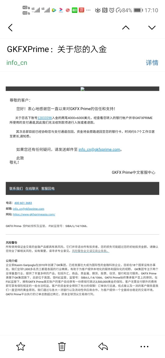 6月25号,早上重庆的一家公司秦磊催促我完成入金,可以拿返现,连续入金分别4000美金和6000美金,结果都没有入金到账。这里着重声明一下,我每次入金都是点复制的,防止出错。秦磊说会让平台去查,查了两天,说我入错账号了,还特意问我截图了没,知道我没截图后,一口咬定我入错账户。我让平台提供正确的账户记录,平台拒绝。后来邮件告诉我帮我查,查了一周说查到了,协助我退款,一周过后,又发一封邮件,说那个账户已封,无法帮我退款,让我去联系银行,银行让我报警,警察让我去找法院。难不难!我想告诉大家,这个平台有问题,请大家不要在这个平台做了,很容易被骗。出金要一周以上。而且不一定到账。自己想想咋回事吧。具体请看附图。目前我会去找律师通过法院起诉处理。