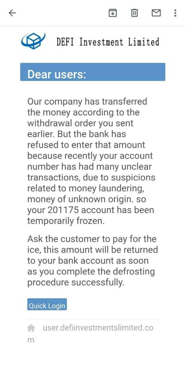 Defi investment send email informed me that my account have been frozen then asked me to pay 10% of profit to de-icing. after I wired money, they confirmed that my money is transferring to my account soon, but after 30 days, I still not received money