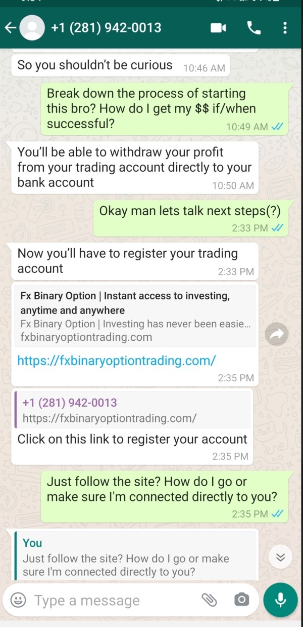 Yea, I feel very gullible, but I was really just hoping to catch a break. I was lured in via a message on Fb that lead to a conversation on Whatsapp1(281)942-0013(shouldve known but its still so terrible). I was at least a bit cautious and only committed to their supposedly smallest account"Bronze" at $500. The guy "Jones" either British or Australian because he continually uses "Mate" did a very convincing job of assuring me that I would have full control of my account.