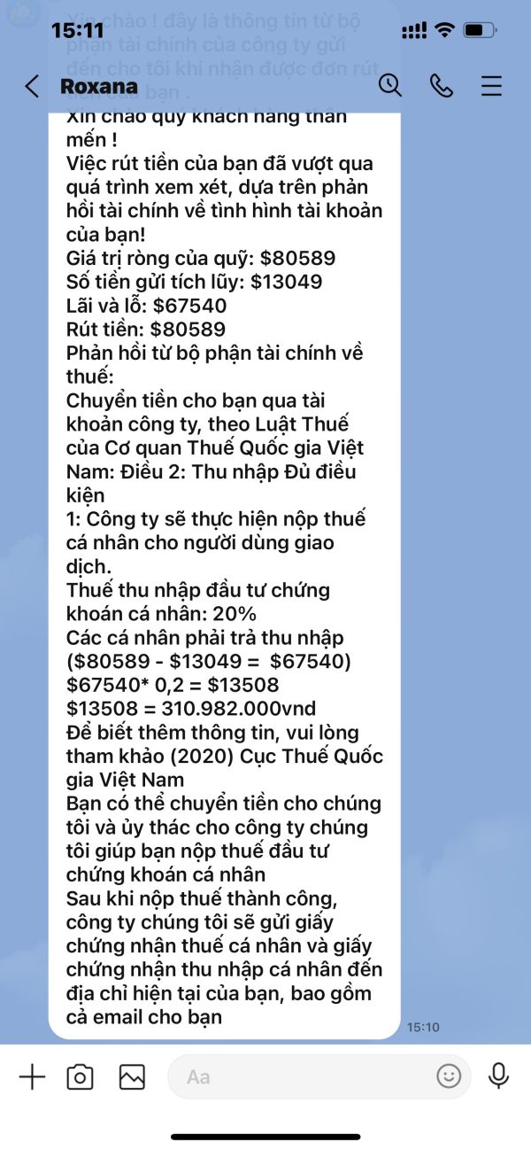 tôi bị lừa nạp tiền để giao dịch lúc rút tiền thì bắt đóng thuế thu nhập 20% đóng xong thì chặn hết tôi ko thể liên lạc được