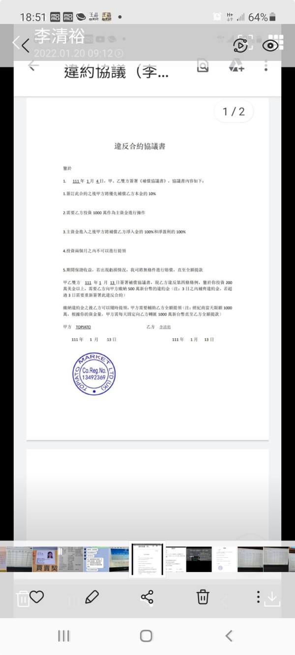 Topiato 簽協議誘惑入金,卻詐騙潛逃拒絕賠付,致損失2536241.49美元,無法出金。