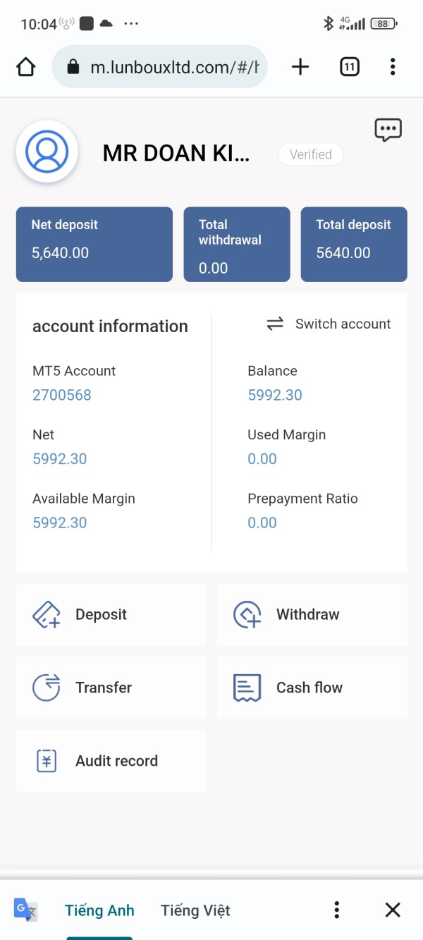 Cách đây 2 tháng, có người giới thiệu và mời tôi tham gia đầu tư forex. Vì tôi là người mới nên không hiểu rõ về thị trường forex. Nhưng nhìn thấy cách mà họ kiếm tiền nên tôi đã đồng ý tham gia. Có một support trên Telegram yêu cầu tôi cung cấp thông tin cá nhân để mở tài khoản tại sàn BKYHYO và tôi đã nạp vào 1000$ đầu tư. Nhưng chuyển khoản cho một người khác chứ không phải nạp tiền trên sàn. Trong 1 tháng gần đây, họ thay đổi tên sàn đến 2 lần là GRAND SIGNAL MARKETS và LUNBOUX LIMITED. Tất cả các sàn đều không có giấy phép kinh doanh. Tôi đã tham gia giao dịch và có lợi nhuận. Hiện tại tài khoản tôi có 5990$. Bỗng nhiên tài khoản Telegram của support và người mời tôi tham gia lúc đầu đã bị khóa. Không thể đăng nhập trên nền tảng MT5, không tìm thấy tên sàn Lunboux Limited trên MT5. Tôi nhận thấy bất ổn nên tôi đã làm đơn yêu cầu rút tiền trên lunbouxltd.com. Đã qua 48 giờ vẫn không xét duyệt cho tôi rút tiền. Đây là một quá trình lừa đảo tinh vi. Hãy giúp tôi có thể lấy được tiền