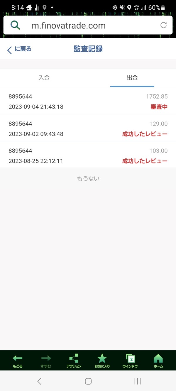 お世話になります。出勤は最長で24時間以内と言われていましたが全額出金の手続きをした所、1週間半以上立っても入金がありません。担当の方は、調べて連絡しますや対応していますと先週ありましたが、今週は既読にもなりません。finovaのサポートにもメールしましたが連絡がありません。出金の手続きを間違えたのかとも思いましたので、審査中になっている出金手続きを取り消し依頼しましたが担当とfinovaから連絡なしです。入金がないと戻ってくるのかも心配な為、ご協力お願い出来ますでしょうか?よろしくお願い致します。必要な情報などありましたら連絡下さい。