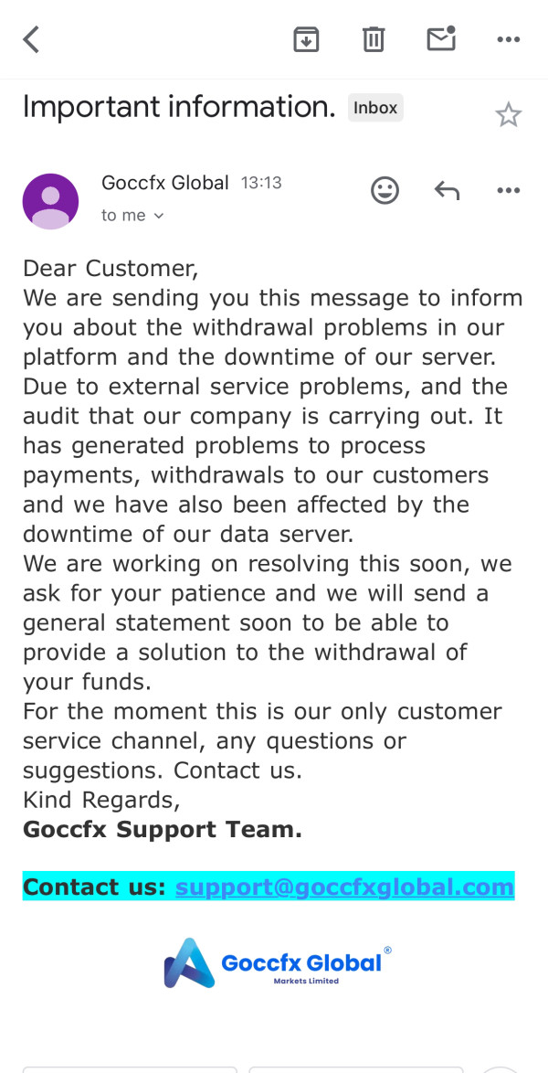 I have been investing on the Goccfx platform for more than 2 months, on January 15th I requested a withdrawal of more than 250,000 dollars and for the first time my withdrawal was not approved and I have been waiting for more than 2 weeks.Today the support team contacted me, explaining what happened. They say they will fix the withdrawal problem soon. Goccfx I hope you fix this and can help me with my withdrawal.