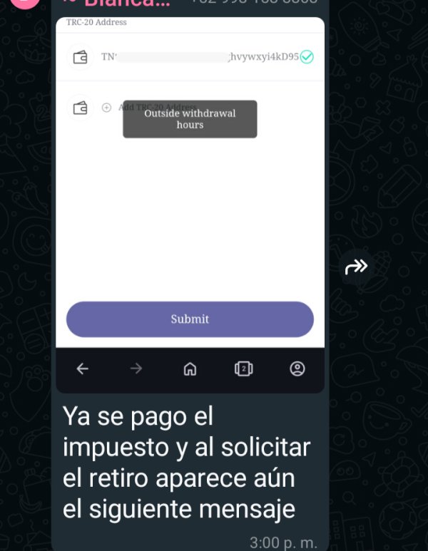 Desde el 6 de agosto la plataforma pidió paciencia y sin previo aviso bloqueo los retiros, empezó a hacer promesas grandes de duplicar el dinero si invertirán en ese momento, hoy 19 se verían reflejados los retiros del día 15 lo cual no sucedió, hoy salieron con el cuento de que necesitábamos abonar un % extra por impuestos a estados unidos cuando lo hicieron salieron que se vería reflejado hasta el 26 de agosto y que si no pagamos a una cuenta con qr completamente externa a la plataforma de paradero dudoso no regresarían el dinero, presionan para que se pague esto y aún así ahora salen con que hasta el 26 de agosto para fotos y mas evidencias favor de ayudarnos