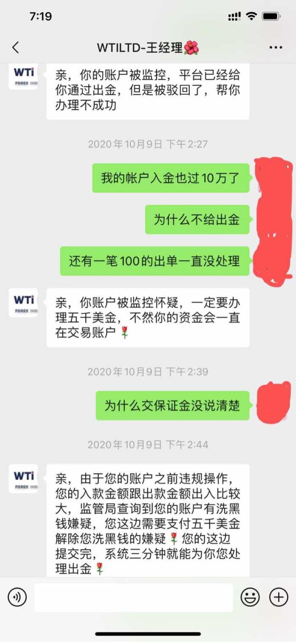 9月通过微信群介绍在WTI LIMITED客服开户,本金5万人民币,9月中亏损4万,23号帐户交给微信群大神操作获利1万多美金,但在10月初发帐户有双向交易有多单与空单,已经禁止交易,客户说交1万美金保证金后才能出金。但交了保证金后一直出金被驳回,10月9号客服说帐户被监控还要交5千洗嫌费,现在帐户上的余额好像数字一样能看不能动,求助无门曝光这平台的行为,希望有人监管处理。