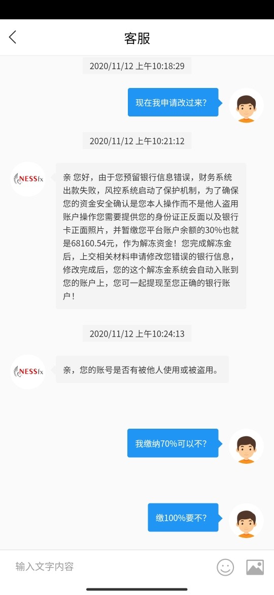 Nessfx入金操作盈利后,被篡改账号无法出金。微信聊天拉拢,QQ程序员说明是多年经验国外深造回来带领操作。盈利后,在提现期间改了账号,还好我的每一步操作都是有截图的。最后他们说我账号需要缴纳68160.54元来解冻。步步深入!在我发火后,关闭了APP。
