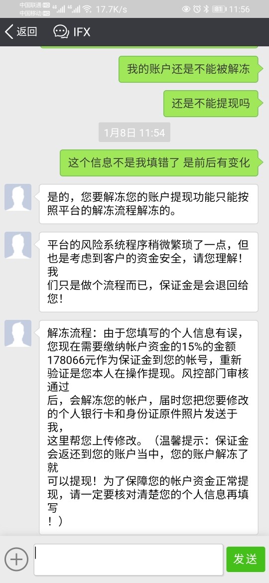IFX操作收益后银行卡号被平台改了导致无法出金,提现记录一直审核中,说是已经把账户冻结了,需要缴纳账户余额的15%充值到账户中才能申请修改银行卡信息,才能解冻账户,才能提现出来,意识到这是诈骗了,现在本金都被套在里面出不来,已报案处理,大家别再上当,还有在这个平台上曝光也请协助排查处理,非常感谢!