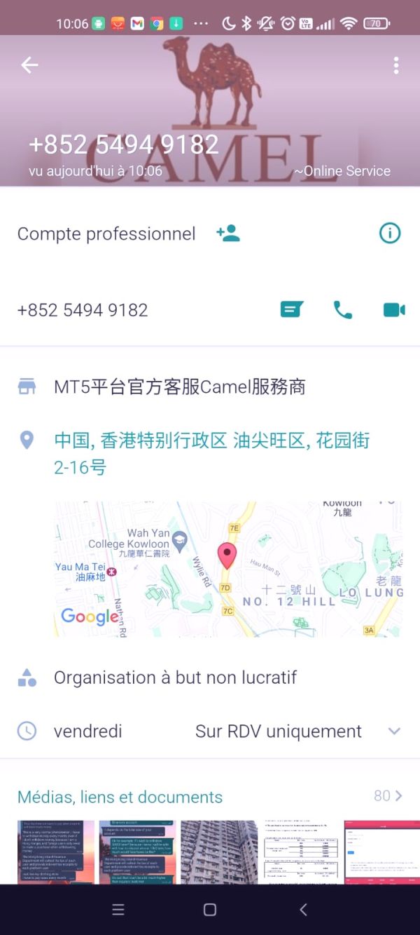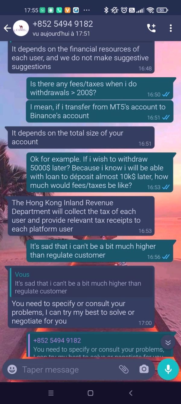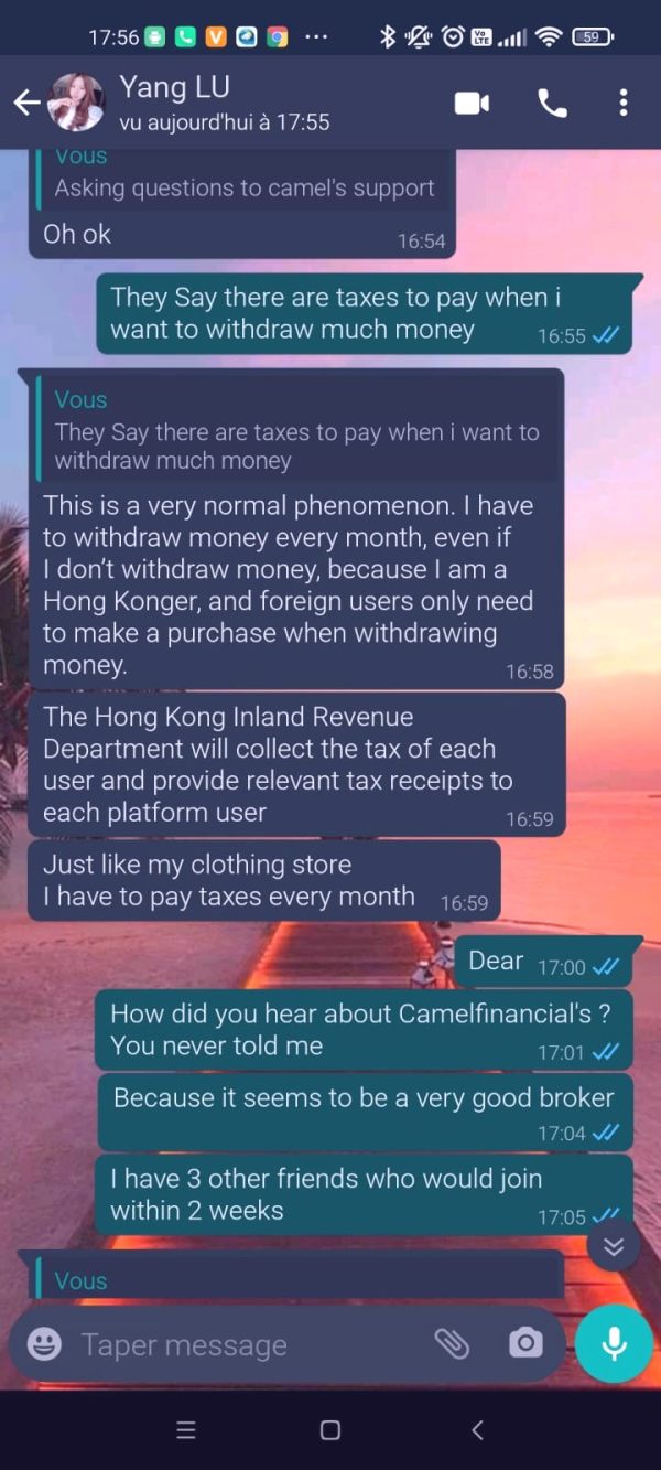 Bonjour. Je confirme malheureusement les doutes frauduleux du broker CamelFinancial. Je me suis fait "hameçonner" sur l'application Tiktok, par une personne prénommée Yang LU, qui a réussi à me convaincre de la suivre dans le trading sur Metatrade 5 grâce à l'appui d'un "oncle" qui travaille dans la finance depuis de nombreuses années et qui n'a jamais fait d'erreurs. Je me suis laissé tenté et ai sélectionné ce broker CamelFinancial qu'elle me recommandait sans souci. J'ai déposé environ 200$ puis j'ai pu rentrer dans mes frais rapidement. Elle m'a proposé de m'envoyer 500$ directement sur mon compte MT5 afin de monter jusquà environ 2000$. Hier, elle évoque devoir payer des taxes, que cela lui coûte cher... Je demande à effectuer un retrait au broker, impossible car pour eux, c'est un seul retrait par semaine... J'avais retiré 200$ la semaine dernière, j'ai du attendre aujourd'hui et là on m'envoie un document sans logo sans rien en me disant en gros "voilà, tu dois payer les 800 et quelques $ jusqu'au 15 Juin sinon ton compte sera bloqué...."La femme s'emporte même en me disant de lui rendre ses $, chose que je ne peux faire vu que l'argent est sur mon compte MT5... Et bien sûr, elle parle d'évoquer l'affaire sur les réseaux sociaux et Interpol également afin de m'intimider...Ci-joint quelques screenshots avec similitudes entre broker et la femme de titktok et la fameuse taxe à payer....