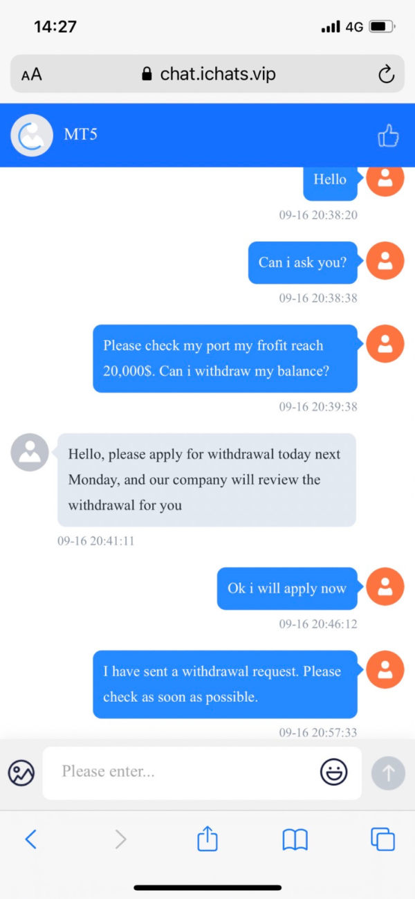 เคยทำการถอนเงินครั้งแรกไม่อนุมัติบอกว่า transaction ไม่ได้ตามเป้า จะต้องจ่ายค่าดำเนินการ 20% ถึงจะถอนได้แต่ถ้าไม่จ่ายค่าดำเนินการให้ทำกำไรถึง20,000$ จึงไปเทรดเพื่อทำกำไรให้ถึงตามเป้า โบรกบอกว่าให้ทำเรื่องมา จะตรวจสอบให้ จนถึงตอนนี้ยังไม่มีการตรวจสอบและอนุมัติรายการ ล่าสุดบล๊อคแชทที่คุยทั้งหมด