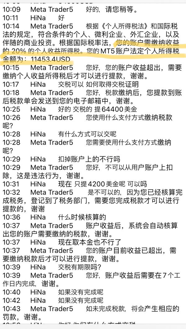 开始说不需要手续费时,就很可疑。第1次提款也没有问题,没有任何多收的费用。 第2次申请提款时,就说按法律要交收益的20%所得税,接二连三的算错税,并加手续费,说好了补齐了就不需要任何费用,2小时后出款。结果税补齐了,没有任何交税交款收据凭证,申请提款时左等右等,最后又说检测到交易账户有风险,要交总资产的10%风险金。过程实在可疑,所以不敢继续交款,决定曝光。 曝光后今天3/7与我联系,不但没有公正处理,反而又出新招,告知说如果5天期限(还剩2天)内,交不上风险金就冻结我的账户,并且无视我说报警,甚至最后说希望我继续曝光。 警惕! 若有同一时期同样经历交易者,请谨慎缴税,因为交完税没有任何收款交税凭证,还会告知莫名其妙的招式让你无法出金,甚至威胁冻结账户!