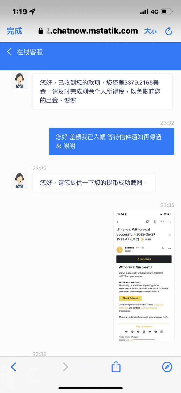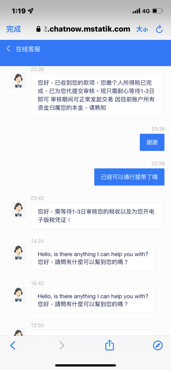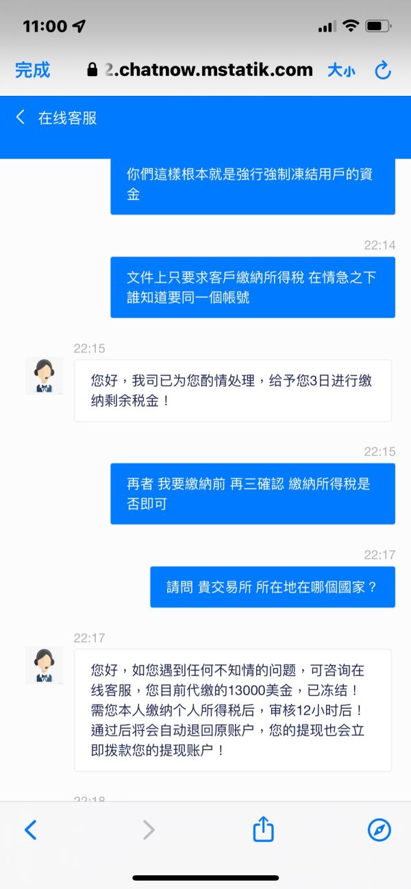 6/23提出金申請,交易所郵件通知需先繳所得稅 6/29再來信通知48小時內繳清否則對我提出告訴還要通知親友我逃漏稅, 6/28繳稅前 經再三確認 繳清是否可以提幣、客服表示可以提幣 同時附上兩張入金截圖,以示入金繳稅完成! 經由客服確認無誤,並告知等1-3天開立憑證 交易所7/1來信告知 13000U並非由本人繳納 必須由本人親自繳納 所以凍結了13000的U 並且7/4繳稅完畢否則凍結我的幣,上繳交易所公庫 這理由根本是刁難,強盜行為 一開始不先說明必須同一帳戶 而且 截圖給客服、客服就應該檢查到ID 當下告知沒問題! 本人的所以資產 全在貴所的MT5 帳戶裡頭 即使是情商朋友幫忙 也是繳完稅還這般刁難 交易所這些行為實在是無法接受