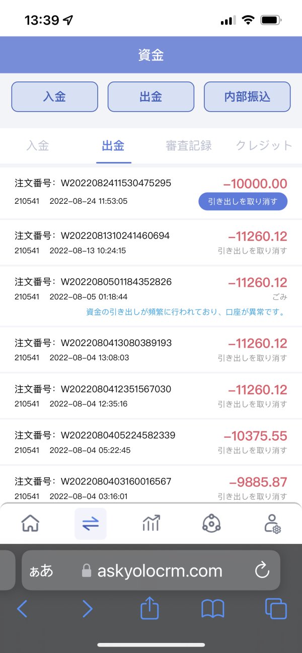 何度出金申請しても手続きが進まないので、取り消ししては、再度申請してまた取り消しての繰り返しです。 そのうち、口座が異常だと言いがかりをつけて、結局出金させないようにしてます。