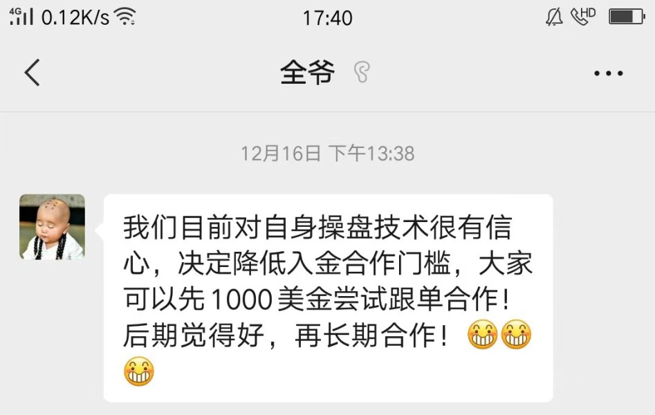 这个黑心代理在朋友圈群发入金1000为诱饵,盈利合作,让你看到盈利,其实是后台修改了数据,敢入金就叫你爆仓,之后拉黑,联系不上,记住头像不要被骗,有可能改成其他微信名。登全,潇慕……