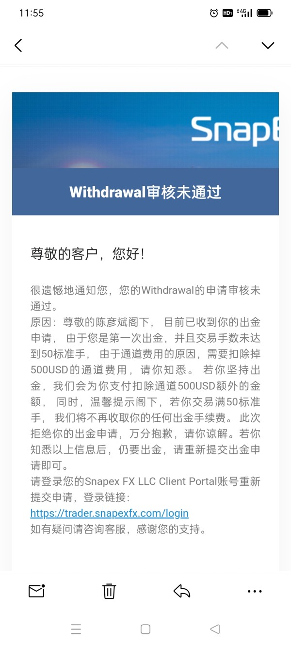Withdrawal审核未通过 尊敬的客户,您好! 很遗憾地通知您,您的Withdrawal的申请审核未通过。 原因:尊敬的陈彦斌阁下, 目前已收到你的出金申请, 由于您是第一次出金,并且交易手数未达到50标准手, 由于通道费用的原因,需要扣除掉500USD的通道费用,请你知悉。 若你坚持出金,我们会为你支付扣除通道500USD额外的金额, 同时,温馨提示阁下,若你交易满50标准手, 我们将不再收取你的任何出金手续费。 此次拒绝你的出金申请,万分抱歉,请你谅解。若你知悉以上信息后,仍要出金,请重新提交出金申请即可。