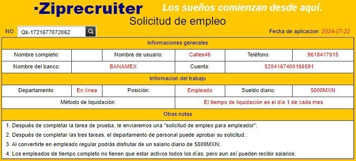 El día 22 de julio del año 2024 mediante una publicacion de facebook me puse en contacto al número +221 77 059 1468 que en whatsapp tiene el nombre de Jessica la cual me proporciono informacion de un trabajo en linea de la empresa denominada ZipRecruiter Mall para mi registro se me mando el siguiente enlace: https://work-marketing.vip el registro lo hice con mi numero de telefono y un código que te proporcionan ellos el cual es HR948Q posteriormente te dicen que su trabajo se realiza via telegram en conjunto con la página y te dan un contacto que es la recepcionista Valeria que en telegram responde a nombre de @ValeriaZM_SHEIN412 el link para rastrearla es https://t.me/ValeriaZM_SHEIN412 quien te dice que te unes al equipo de trabajo para completar la mision de SHEIN diciendo que vas a ganar comisiones a traves de clicks,te da los contactos de los empresarios para depositar la cantidad de dinero que esta supuesta empresa determina, perdi un total de 97,930