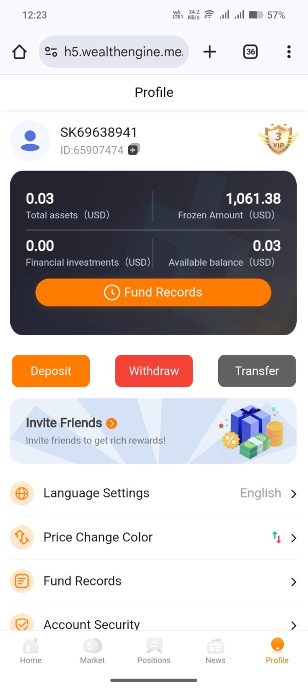 I am trading with wealth engine app from 4 months.now wealth engine frozen my total funds 1061 USDT without any reason and without any notice,now wealth engine app asking us to deposit 10% of total frozen amount.I have also deposited 100 USDT but still my account does not unfreez my fund please help me and my team and report this complaint to wealth engine and ask unfreez our funds thanks regards.