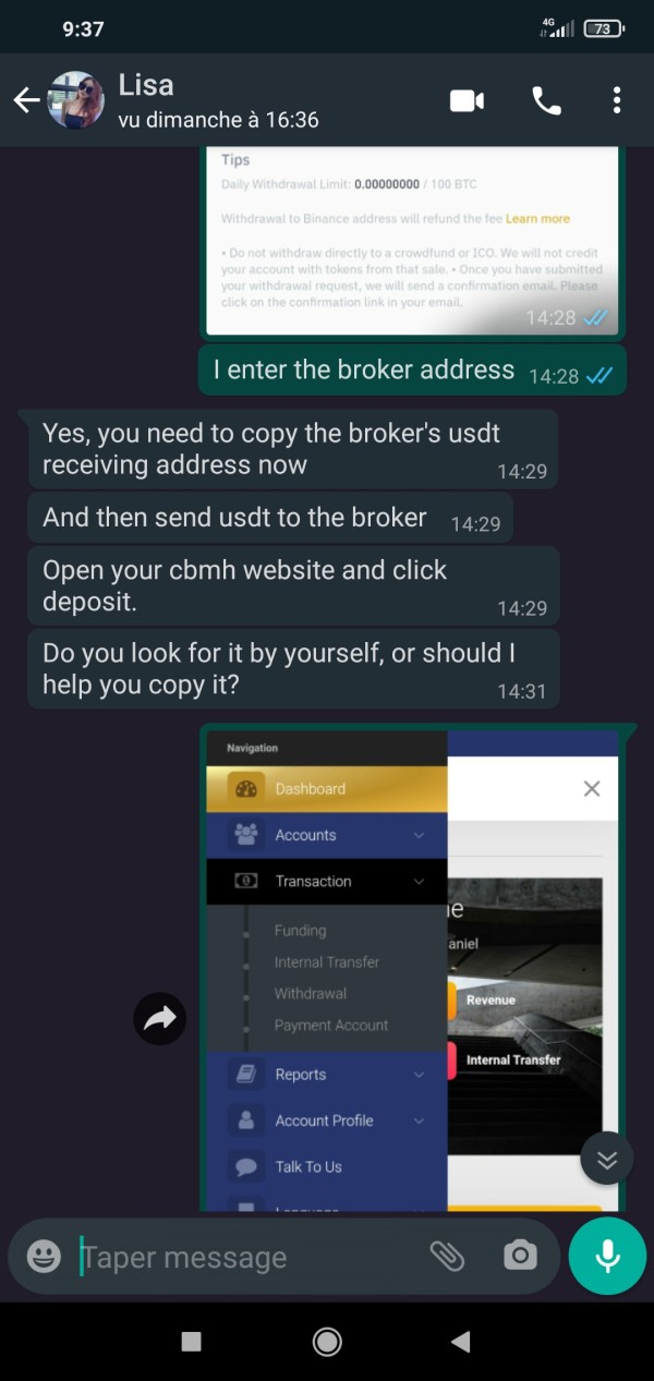 CBMH LTD asked me to pay taxes when I first tried to withdraw, corresponding to 14% of my invested money. They told me I could then withdraw without limit. I paid it with the help of the Chinese girl the 26th of July 2021, but when I tried to withdraw my money to my bank account, they refused it because they suspected that I am doing money laundering. They justificated it by saying that my account was topped up by several people, since the girl sent me money through the platform.